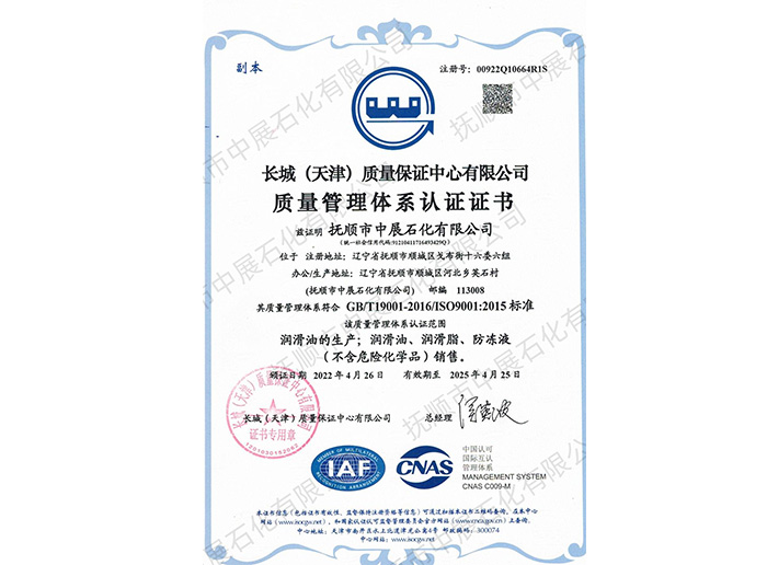 本公司是GB/T19001-2016/ISO 9001:2015標準質量體系認證單位(注冊號:00922Q10664R1S),是GJB9001C-2017標準武器裝備質量管理體系認證單位。撫順在上個世際五十年代就已是我國軍用油脂的生產基地,本公司正在發揚和繼承這一優良傳統,全力投入于各種軍用、航空油脂的生產與研發。